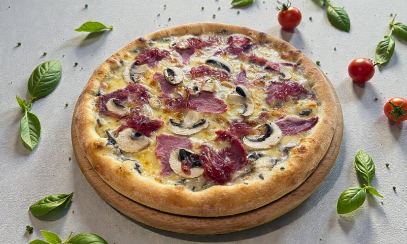 Соус альфредо, сир моцарела, телятина пастромі, гриби, сир пармезан, цибулеве чатні