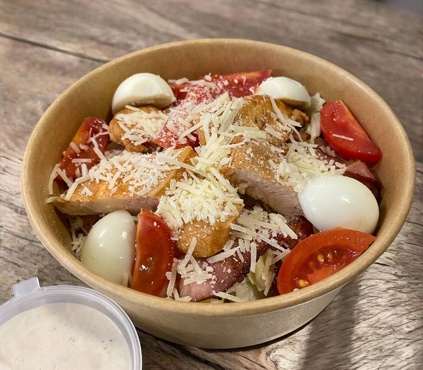 салат айсберг, томат чері, яйце перепелине, бекон, філе куряче, пармезан, соус цезар