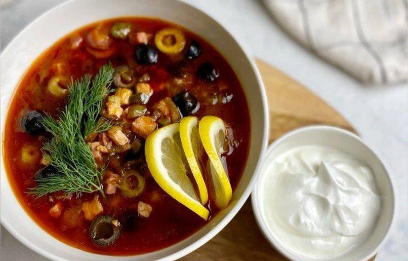маслини, лимон, філе куряче, бекон, ковбаски баварські, шинка, морква, цибуля, огірок маринований, сметана