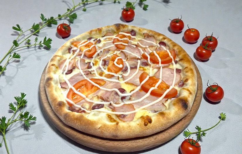 Соус сливочный, сыр моцарелла, бекен, колбаски охотничьи, помидор, соус фирменный
